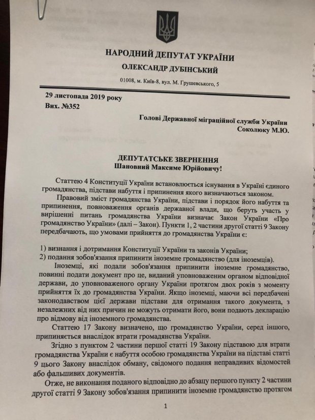 Сообщается, что Айварас Абромавичус в 2014 году получил гражданство Украины, однако по состоянию на 26.11.2019 года не прекратил литовское гражданство. Дубинский написал обращение на имя главы Государственной миграционной службы Соколюка.