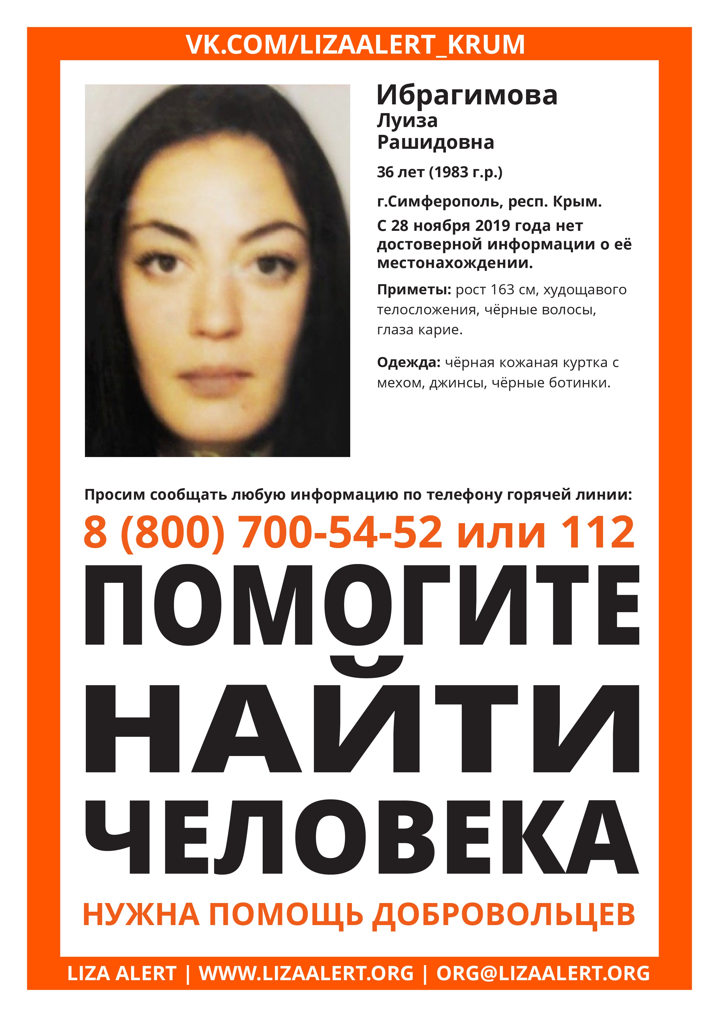 «С 28 ноября 2019 года нет достоверной информации о её местонахождении. Приметы: рост 163, худощавого телосложения, волосы черные, глаза карие. Была одета: черная кожаная куртка с мехом, джинсы, черные ботинки», — говорится в сообщении.