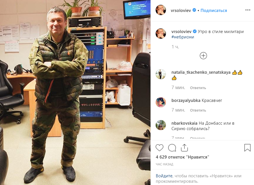 Также Соловьев обнародовал в своем Instagram фото в кроссовках — это было своеобразным ответом на ироничные слова Зеленского о страхе испачкать в Украине обувь дорогого бренда Brioni.
