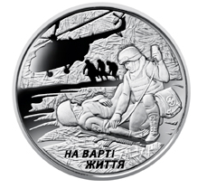 На реверсе монеты размещена стилизованная композиция: военный медик оказывает помощь раненому бойцу во время боевых действий, зеркальные силуэты вертолета и группы военнослужащих, идущих к нему с носилками (слева) надпись: «На страже жизни» (внизу).