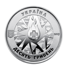 На аверсе монеты размещен малый Государственный Герб Украины (слева), надпись Украина (вверху полукругом), год чеканки монеты 2019 (справа), номинал десять гривен (полукругом внизу). В центре — стилизованная композиция: пламя, на фоне которого крест — символ медицины, вокруг — камуфлированные обломки, символизирующие драматизм войны; внизу между обломками — логотип Банкнотно-монетного двора Национального банка Украины.