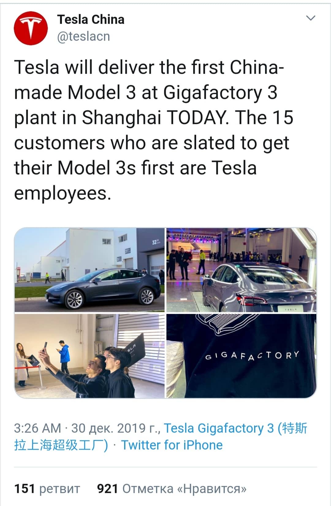 «Сегодня Tesla доставит первую модель китайского производства на заводе Gigafactory 3 в Шанхае», — указано в сообщении.