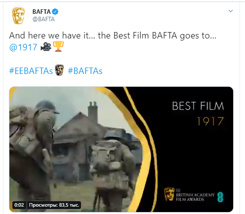 Кроме главной награды, «1917» победил в номинациях «выдающийся британский фильм», «лучший звук», «лучшая работа художника-постановщика», «лучшая операторская работа», «лучшие спецэффекты».