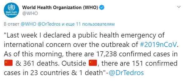 По словам главы ВОЗ, в мире зафиксировано 17 тыс. 288 случаев заражений вирусом 2019-nCoV. Из них 361 был смертельным.