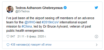 Как сообщил Гебреесус в Twitter, он проводил в аэропорт международную группу, которая вылетела из Женевы в Китай. Возглавляет миссию доктор Брюс Айлворд. Глава ВОЗ назвал его «ветераном» прошлых чрезвычайных ситуаций в сфере здравоохранения.