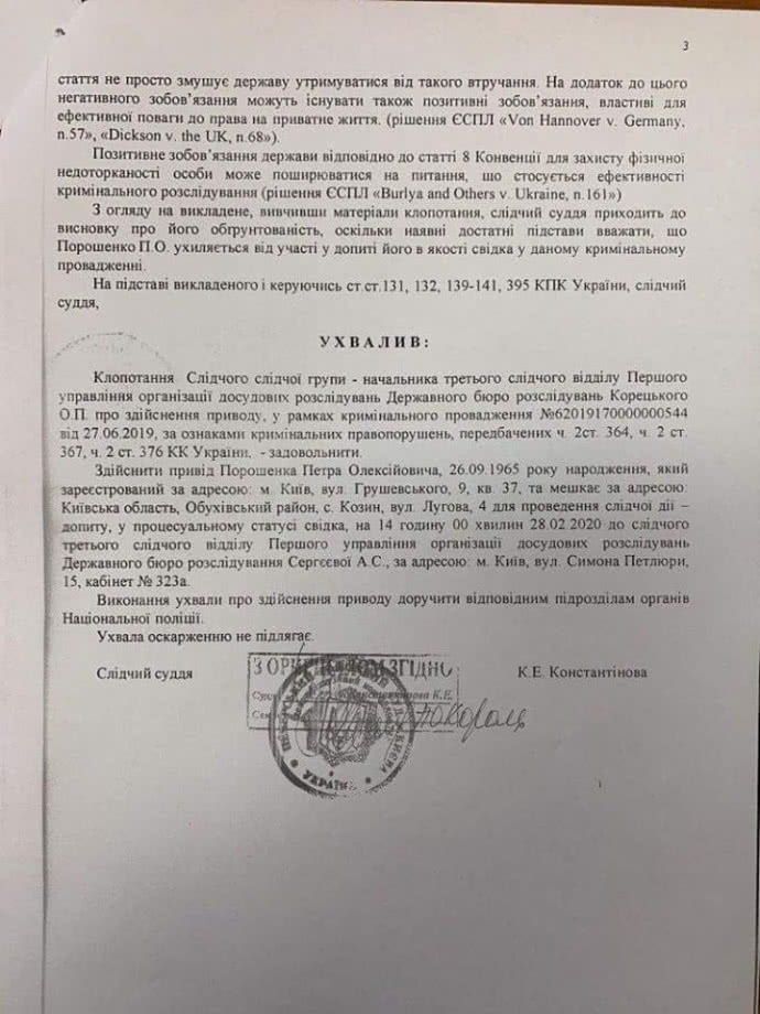 В то же время народный депутат от «Слуги народа» Александр Дубинский опубликовал в Facebook копию постановления суда, касающегося февральского допроса. В тексте отмечается, что суд удовлетворил ходатайство следователя ГБР Корецкого А.П.