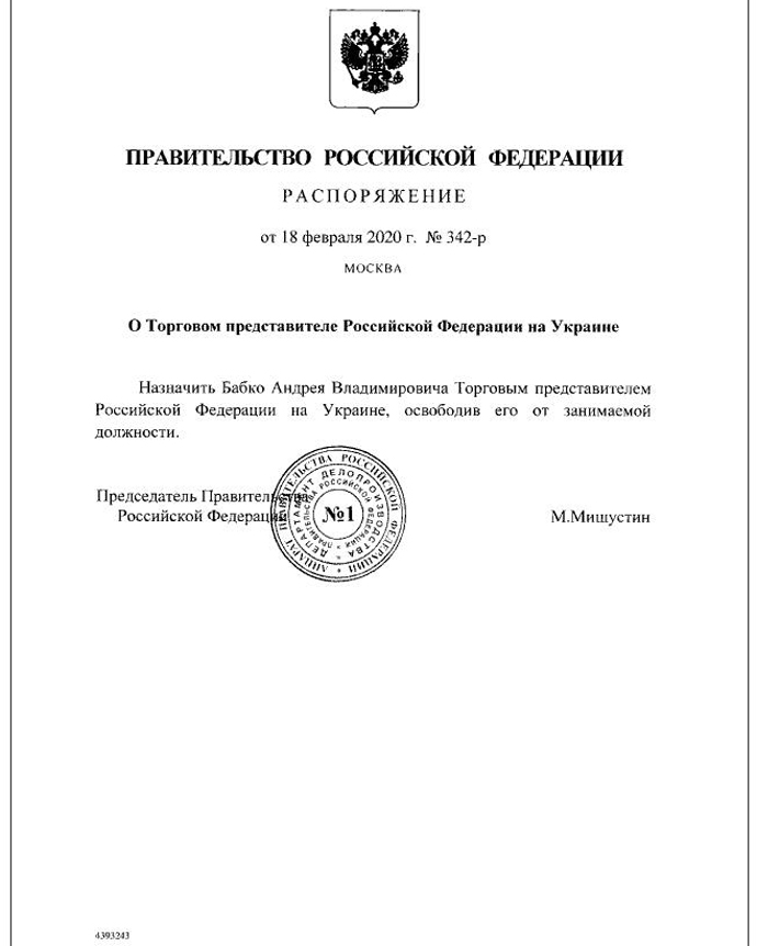 «Назначить Бабко Андрея Владимировича торговым представителем РФ в Украине, освободив его от занимаемой должности, — указано в документе распоряжения № 342-р.