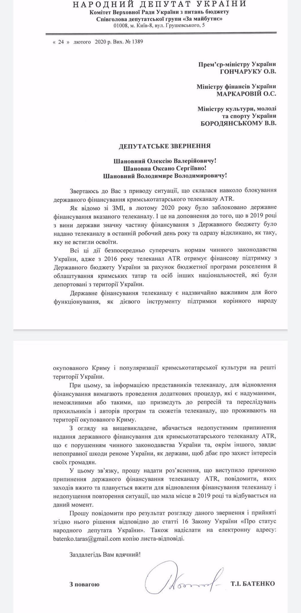 Народный депутат Украины, сопредседатель депутатской группы «За майбутнє» Тарас Батенко обратился к президенту Украины Владимиру Зеленскому, а также к премьер-министру Алексею Гончаруку, министру культуры, молодежи и спорта Владимиру Бородянскому и министру финансов Оксане Маркаровой с просьбой объяснить ситуацию, которая сложилась вокруг господдержки и финансирования крымскотатарского телеканала ATR.