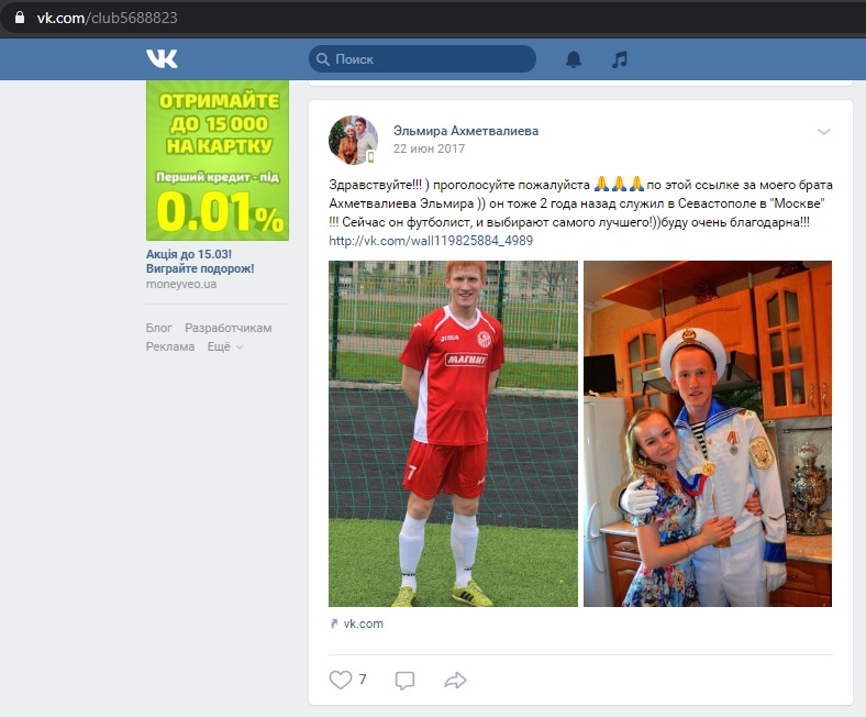 Материал основан на публикациях в соцсети «ВКонтакте». В частности, в соцсети есть группа ракетного крейсера «Москва», в которой моряки и родственники обмениваются информацией о службе на корабле. В группе размещено сообщение Эльмиры Ахметвалиевой с призывом проголосовать за ее брата-футболиста, который служил на крейсере «Москва». Сообщение было проиллюстрировано фото мужчины с медалью за оккупацию Крыма.