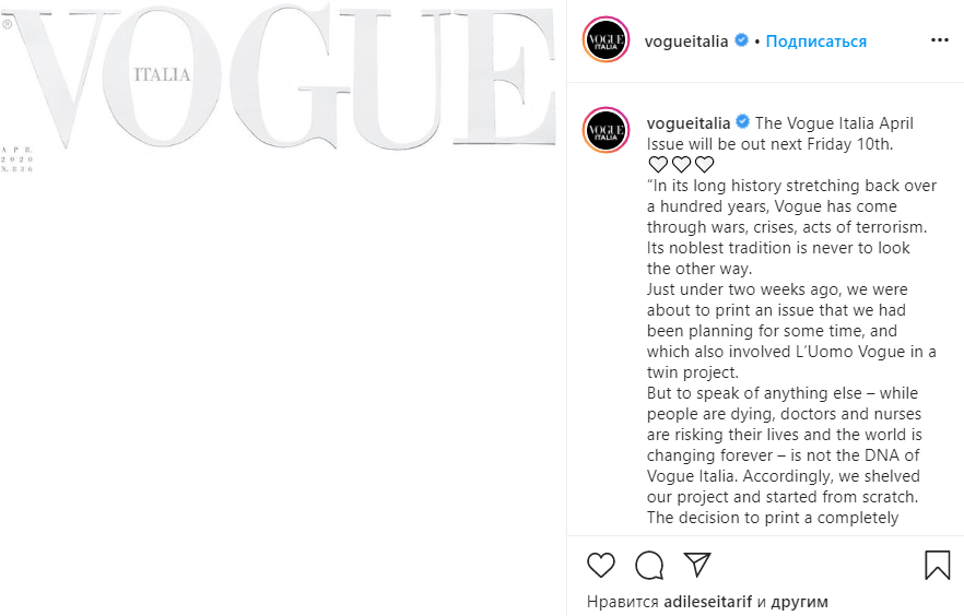 «За свою долгую историю, насчитывающую более ста лет, Vogue пережил войны, кризисы и террористические акты. <...> Чуть менее двух недель назад мы собирались напечатать номер, который планировали в течение некоторого времени. <...> Но говорить о чем-то еще — пока люди умирают, врачи и медсестры рискуют своей жизнью, а мир навсегда меняется — это не ДНК Vogue Italia. Соответственно, мы отложили наш проект и начали с нуля», — говорится в сообщении.