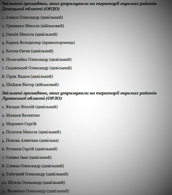 Офис президента Украины опубликовал список 20 украинцев, которых удалось вернуть 16 апреля в рамках обмена удерживаемых лиц Киева с боевиками.