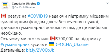 «Канада реагирует на COVID-19, оказывая поддержку местным гуманитарным фондам для обеспечения гибкой длительной гуманитарной помощи там, где это наиболее необходимо. Вот почему мы выделили 700 000 долларов (около 518 тыс. долларов США — ред.) для поддержки гуманитарных усилий в Украине», — заявили в посольстве.