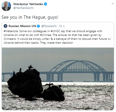 «Побачимося в Гаазі, хлопці», — написав Єльченко, прикріпивши повідомлення представництва Росії в ООН щодо вчорашнього заходу.
