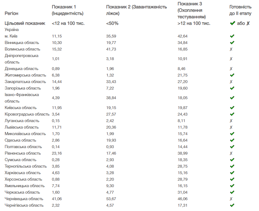 Згідно з показниками епідеміологічної ситуації в регіонах, до другого етапу послаблення карантину залишаються неготовими Волинська, Дніпропетровська, Донецька, Закарпатська, Луганська, Львівська, Рівненська та Чернівецька області.