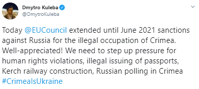 «Сьогодні Рада ЄС продовжила до червня 2021 санкції проти РФ за незаконну окупацію Криму. Вдячний за це рішення. Треба підвищувати тиск за порушення прав людини, «паспортизацію», запуск залізничного сполучення через Керченську протоку, незаконні голосування у Криму», — наголосив міністр.
