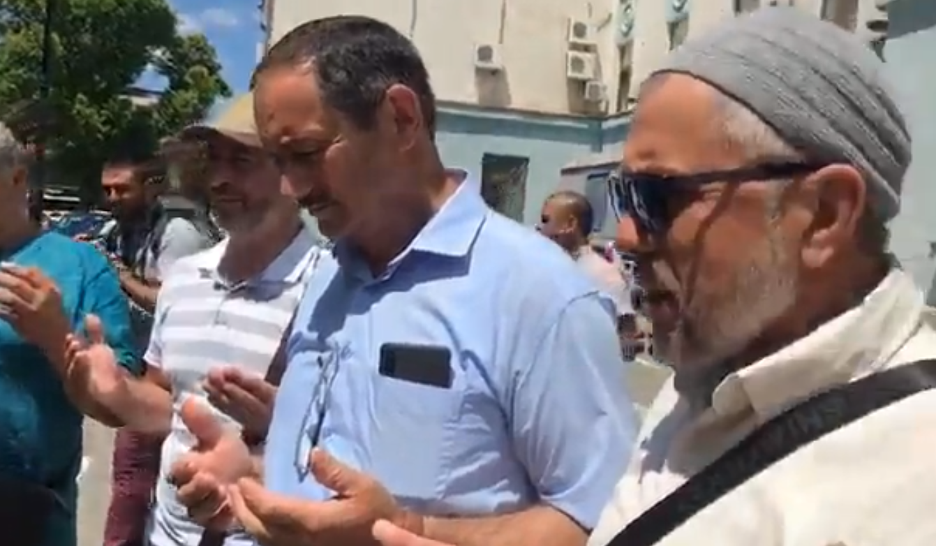 «Очільник» окупаційного «Державного комітету у справах національностей» Криму Альберт Кангієв вийшов до невдоволених кримських татар, які зібралися під будівлею «Радміну» через останню облаву ФСБ. Він, заявивши, що «ми всі зліплені з одного тіста», закликав присутніх до діалогу.
