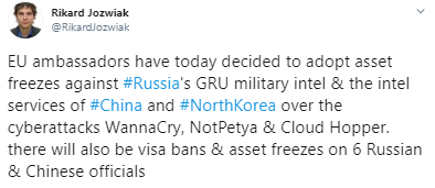 «Посли ЄС сьогодні ухвалили рішення про заморожування активів проти російської військової розвідки ГРУ і розвідувальних служб Китаю та КНДР у зв'язку з кібератаками WannaCry, NotPetya і Cloud Hopper. Також будуть введені візові заборони і заморожування активів 6 російських і китайських чиновників», — написав він.