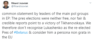 Як повідомив на своїй сторінці в Twitter журналіст Рікард Йозвяк, з посиланням на спільну заяву партій Європейського парламенту, вибори в Білорусі не були ні вільними, ні справедливими і вказують на перемогу Світлани Тихановської.
