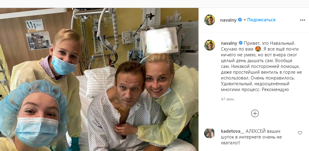 «Привіт, це Навальний. Сумую за вами. Я все ще майже нічого не вмію, але ось вчора зміг цілий день дихати сам. Взагалі сам. Жодної сторонньої допомоги, навіть найпростіший вентиль в горлі не використовував. Дуже сподобалось. Дивовижний, недооцінений багатьма процес. Рекомендую», — написав він