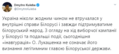 Про це після таємної інавгурації Лукашенка заявив міністр закордонних справ України Дмитро Кулеба на офіційній сторінці у Twitter.