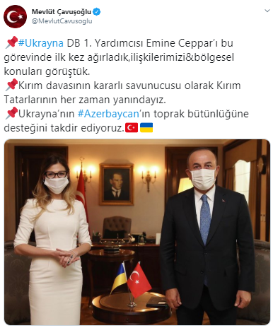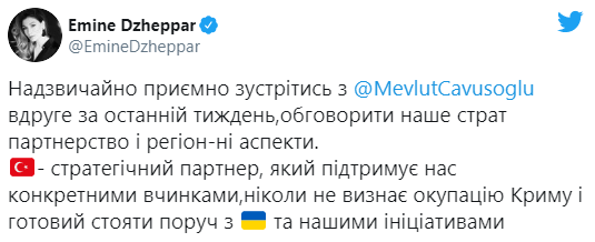 «Туреччина — стратегічний партнер, який підтримує нас конкретними вчинками, ніколи не визнає окупацію Криму і готовий стояти поруч з Україною і нашими ініціативами», — написала дипломат у своєму Twitter.