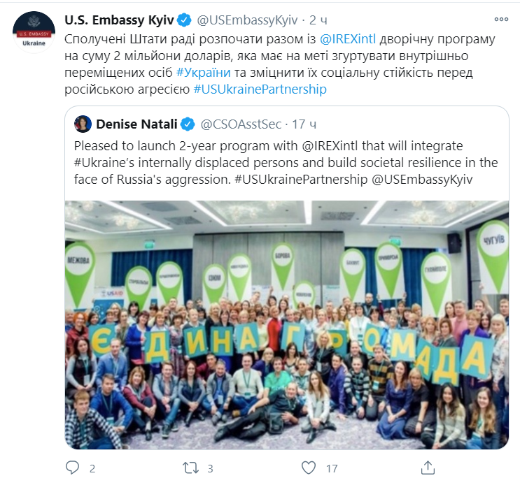 «Сполучені Штати раді розпочати разом з IREX дворічну програму на суму $2 млн, яка має на меті згуртувати внутрішньо переміщених осіб України та зміцнити їхню соціальну стійкість перед російською агресією», — йдеться у повідомленні.