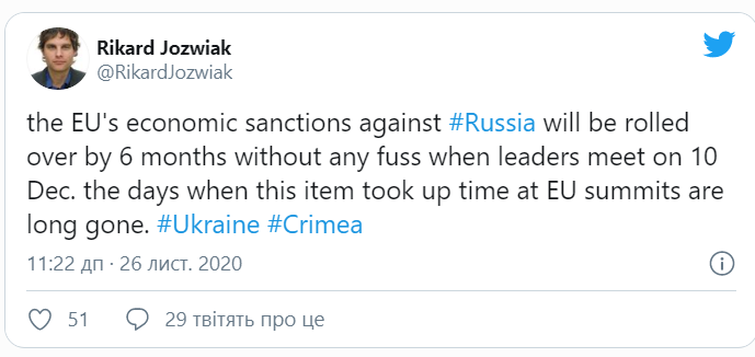 «Економічні санкції ЄС проти Росії будуть продовжені на 6 місяців без будь-яких проблем, коли лідери зустрінуться 10 грудня. Дні, коли цей пункт займав час на самітах ЄС, давно минули», — написав він.