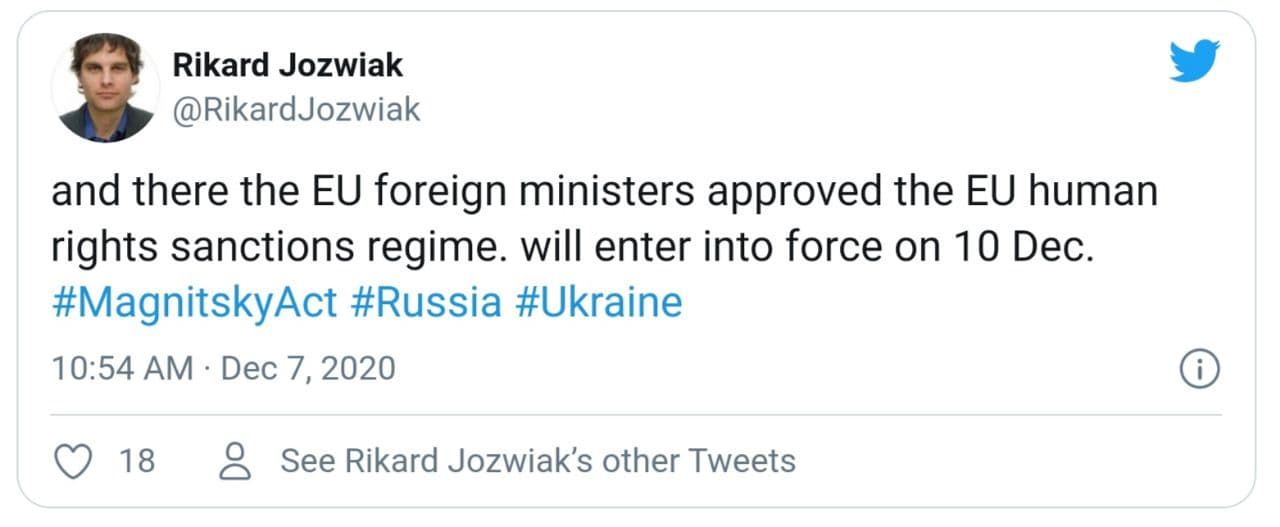 «7 грудня міністри закордонних справ країн-учасниць ЄС схвалили режим санкцій в галузі прав людини. Він набуде чинності з 10 грудня», — написав він.