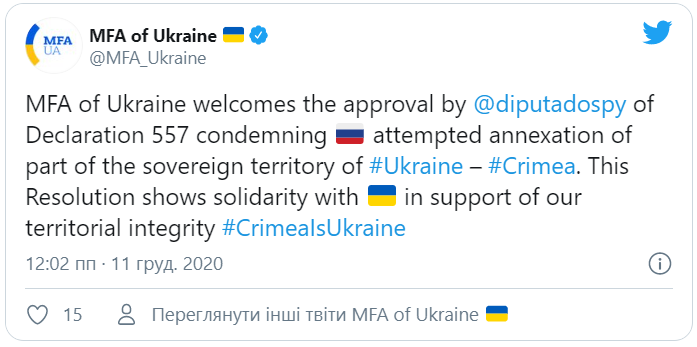 «Вітаємо ухвалення Палатою депутатів Національного конгресу Парагваю декларації №557, що засуджує спробу незаконної анексії Росією Криму. Це рішення є проявом солідарності з Україною і підтримки територіальної цілісності нашої країни», — зазначили у міністерстві.