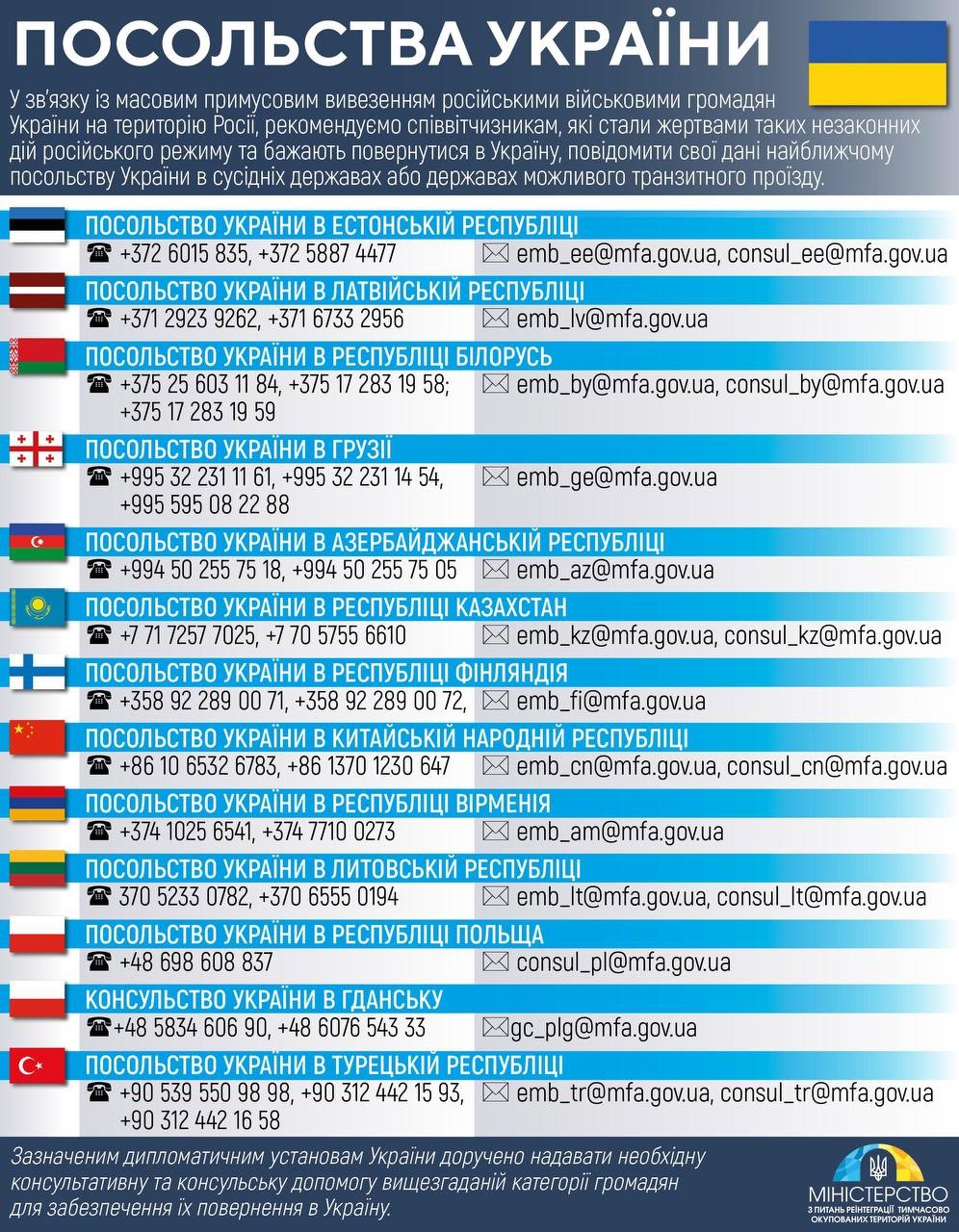 У Міністерстві рекомендують співвітчизникам, які стали жертвами таких незаконних дій російського режиму та бажають повернутися в Україну, повідомити свої дані найближчому посольству України в сусідніх державах або державах можливого транзитного проїзду: