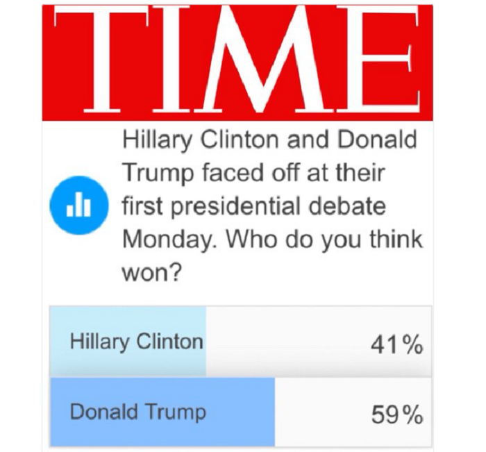 В свою очередь, штаб Дональда Трампа распространил в соцсетях данные опроса журнала Time, согласно которому победителем дебатов является именно республиканец с 59% голосов против 41%. Позже штаб опубликовал данные еще нескольких журналов, чтобы доказать, что Трамп все-таки вышел победителем дебатов.