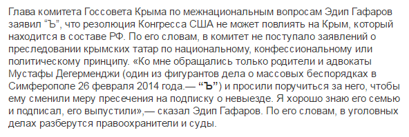 «Ко мне обращались только родители и адвокаты Мустафы Дегерменджи и просили поручиться за него, чтобы ему сменили меру пресечения на подписку о невыезде. Я хорошо знаю его семью и подписал, его выпустили»,− заявил Эдип Гафаров, комментируя новость о том, что адвокат Марк Фейгин намерен инициировать принятие в Конгрессе США, Европарламенте и Парламентской ассамблее (ПА) ОБСЕ резолюций «о недопустимости уголовного преследования крымских татар в Крыму по политическим мотивам».