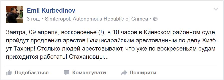 «Завтра, 09 апреля, воскресенье, в 10 часов в Киевском районном суде, пройдут продления арестов Бахчисарайским арестованным по «делу Хизб-ут Тахрир». Столько людей арестовывают, что уже по воскресеньям судам приходится работать. Стахановцы...», – написал Курбединов.
