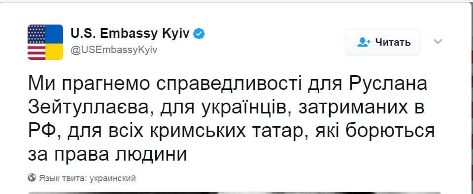 «Мы хотим справедливости для Руслана Зейтуллаева, для украинцев, задержанных в РФ, для всех крымских татар, которые борются за права человека», — говорится в сообщении на странице посольства США в Украине в Twitter.