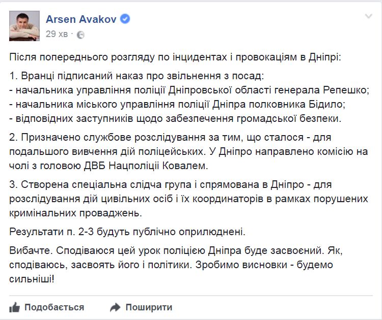 Как сообщил на своей странице в Фейсбук Арсен Аваков, после предварительного рассмотрения по инцидентам и провокациям в Днепре утром подписан приказ об увольнении с должностей: