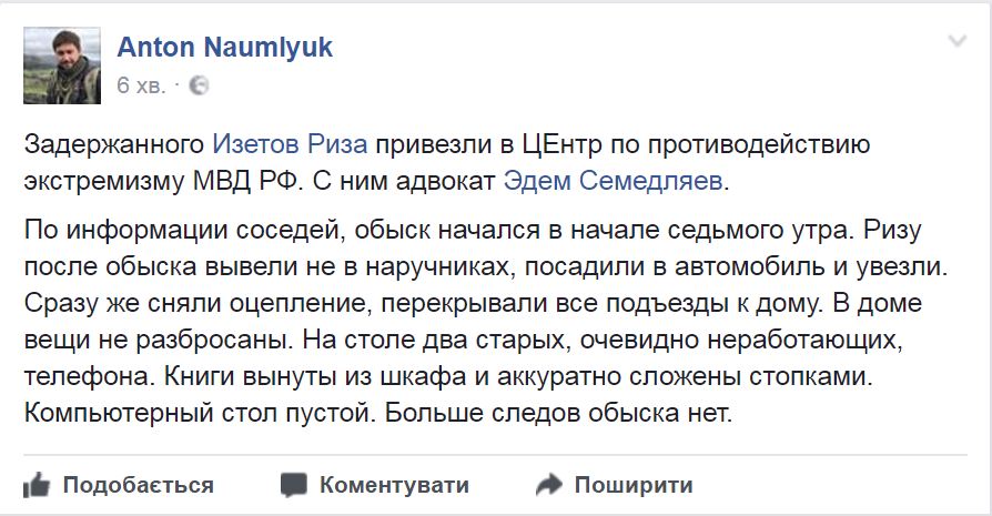Журналист Антон Наумлюк на своей странице в Фейсбук сообщил, что обыск длился с 6:30 до 9 утра. После обыска силовики оккупантов увезли Ризу. С ним поехал адвокат.
