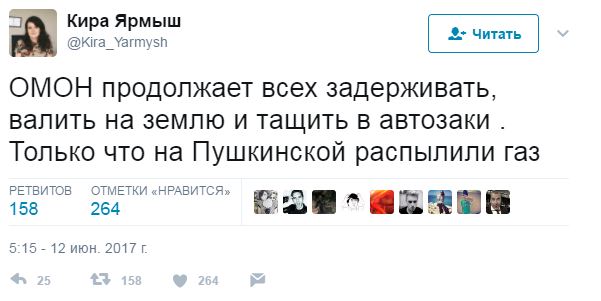 «ОМОН продолжает всех задерживать, валить на землю и тащить в автозаки. Только что на Пушкинской распылили газ», – написала пресс-секретарь Навального Кира Ярмыш в своем Twitter.