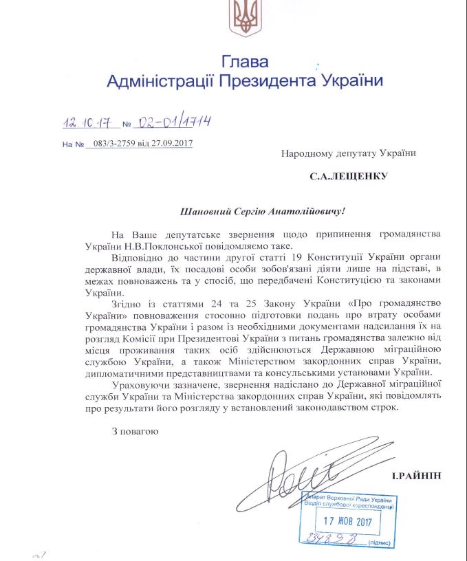 Ни Миграционная служба Украины, ни Министерство иностранных дел, или другие дипведомства не присылали представление о лишении Поклонской украинского гражданства.