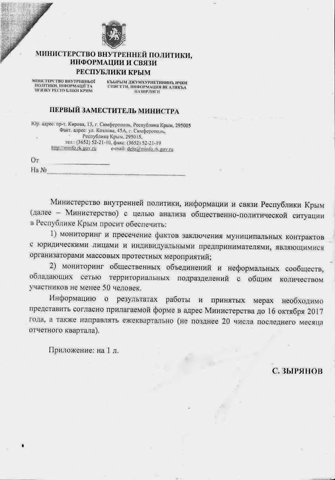 Согласно данному документу, «Министерство политики, информации и связи» Крыма просит обеспечить «мониторинг общественных объединений и неформальных сообществ, обладающих сетью территориальных подразделений с общим количеством участников не менее 50 человек». Распоряжение направляется в городские «администрации» в рамках «анализа общественно-политической ситуации» на полуострове.