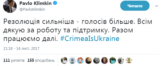 «Резолюция сильнее — голосов больше. Всем спасибо за работу и поддержку. Вместе работаем дальше», — написал он на своей странице в Твиттере.