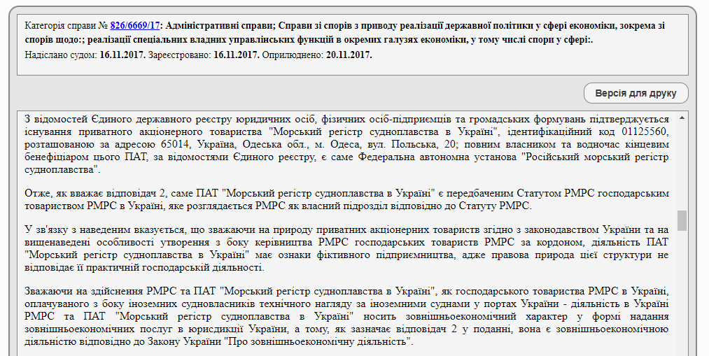 В постановлении Окружного административного суда Киева говорится о том, что это предприятие действительно принадлежит Федеральному автономному учреждению «Российский морской регистр судоходства», однако его деятельность не противоречит законодательству Украины.