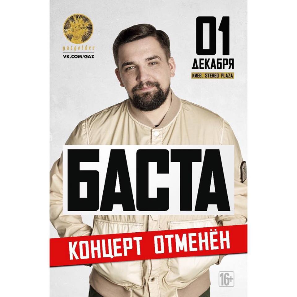 «Концерт Басты в Киеве в Stereo Plaza отменен в связи с запретом въезда на территорию Украины. Все ранее приобретенные билеты подлежат возврату в билетных кассах. Порядок и сроки возврата будут объявлены отдельно в понедельник 4 декабря», — сказано в сообщении организаторов.