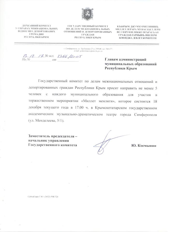 «Государственный комитет по делам межнациональных отношений и депортированных граждан Республики Крым просит направить е менее 5 человек с каждого муниципального образования для участия в торжественном мероприятии «Миллет менлиги», которого состоится 18 декабря текущего года в 17.00 часов в Крымскотатарском государственном академическом музыкально-драматическом театре города Симферополя», — говорится в тексте «документа».