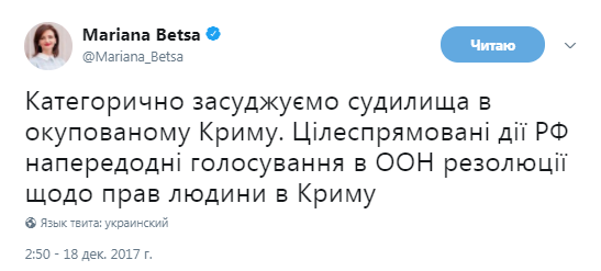 «Категорически осуждаем судилища в оккупированном Крыму. Целенаправленные действия РФ накануне голосования в ООН резолюции о правах человека в Крыму», — написала она.