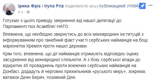 «Уверена, что необходимо обратиться во все возможные институции с информированием о позорном факте участия сербских наемников на стороне марионеток Кремля против нашего государства», — написала она.