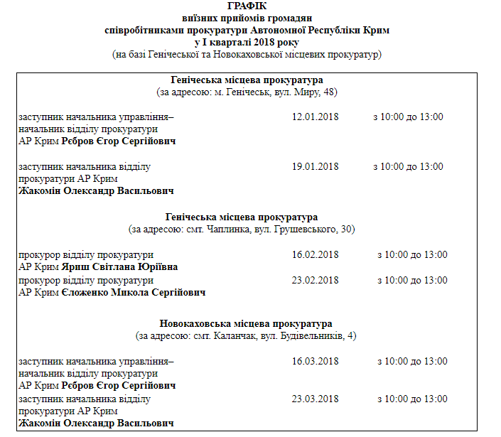 Новокаховской местной прокуратуре (пгт. Каланчак, ул. Строителей, 4): 16.03.2018 — с 10:00 до 13:00 часов, 23.03.2018 — с 10:00 до 13:00 часов.