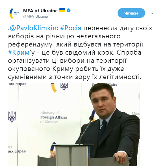 По мнению министра иностранных дел Украины Павла Климкина, проведение российских выборов в Крыму вызывает сомнение в их легитимности.