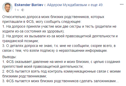 Как сообщил Бариев на своей странице в Facebook, сотрудники российской спецслужбы допросили двух его сестер и тестя. Родители не пошли на допрос из-за состояния здоровья. Бариев уверен, что на его семью оказывается давление в связи с его правозащитной деятельностью.