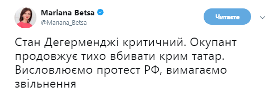 «Состояние Дегерменджи критическое. Оккупант продолжает тихо убивать крымских татар. Выражаем протест РФ, требуем освобождения», — написала Беца.