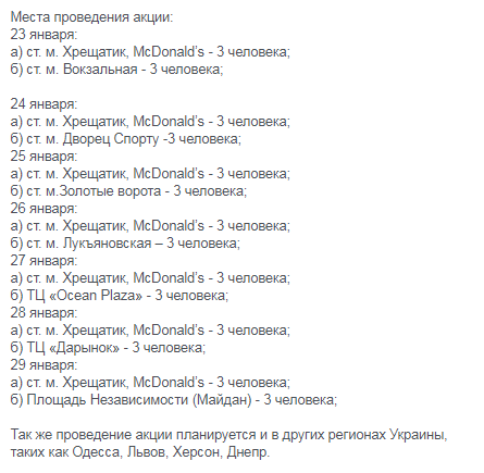 «С 23 января 2018 года планируются мероприятия возле станций метро, целью которых является донесения до людей сложившейся ситуации с правами человека в Крыму и побуждения украинцев и всех неравнодушных присоединиться к марафону, пожертвовать любую сумму, сделать селфи и опубликовать ее в своих социальных сетях с хештегом #Крымский_марафон. В месте проведения акции планируется выставить палатки, повесить информационный баннер и раздача флаеров с информацией о марафоне, и инструкции, что нужно сделать, чтобы присоединиться к нему».